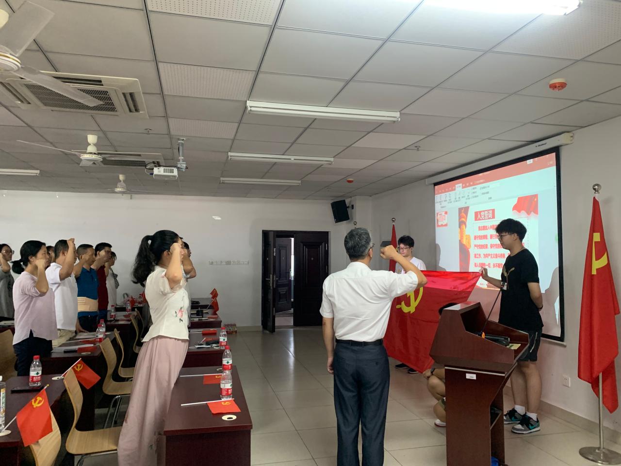 直播会后,与会党员们同唱《没有共产党就没有新中国》,在党委书记邓秀成同志带领下重温入党誓词。随后,公司举行了2021年新党员入党宣誓仪式。