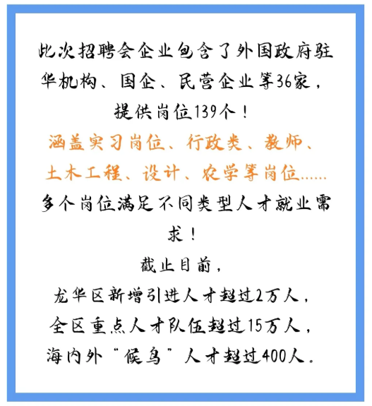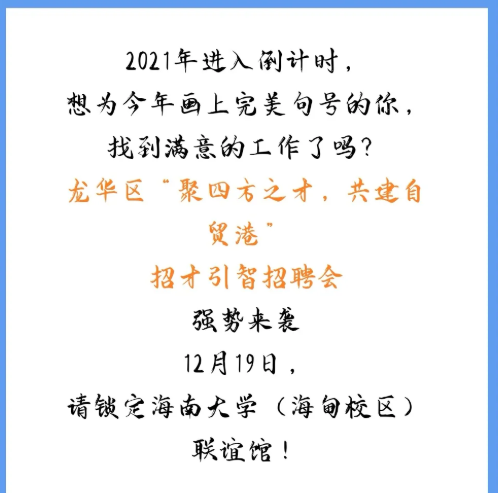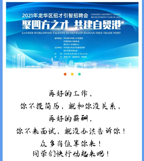 海口市龙华区2021年招才引智招聘会(bw西汉姆联官网平台专场)定于12月19日(本周日)上午08:30-12:00在联谊馆举行,此次参会单位包含了外国政府驻华机构、国企、民营企业等36家用人单位单位,提供的岗位年薪均在6万以上,请大家积极参加!