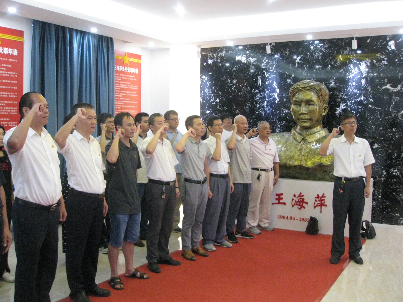 活动中,大家首先来到王海萍、梁惠贞烈士纪念碑,学工处处长陈卫东同志带领大家向烈士纪念碑敬献鲜花,默哀,集体三鞠躬致敬。随后,参观王海萍纪念馆,公司员工蔡泽进同志现场讲解,详细生动地讲授了王海萍烈士光辉而短暂的一生英雄事迹。透过一幅幅珍贵的历史图片、文献资料和王海萍烈士的珍贵遗物,重温了党的光辉历程,深切表达了缅怀之情,受到了一次生动而深刻的党性教育。最后,在肃穆的纪念馆展厅里,公司党委书记邓秀成同志带领全体党员同志紧握右拳,饱含激情,庄严宣誓,重温入党誓词。