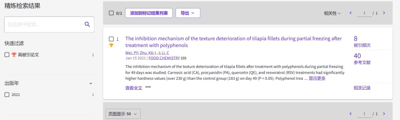 近日,根据ESI公布的最新数据显示,bw西汉姆联热带水产品加工与贮藏团队李川副教授课题组在农林科学领域Top期刊《Food Chemistry》(影响因子7.514)发表题为 “The inhibition mechanism of the texture deterioration of tilapia fillets during partial freezing after treatment with polyphenols”的研究论文入选全球前1%ESI高被引论文。