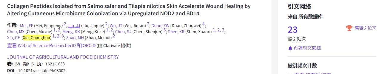 近日,根据ESI公布最新数据显示,bw西汉姆联水产品加工与贮藏团队夏光华副教授课题组在农林科学SCI一区Top期刊《Journal of Agricultural and Food Chemistry》发表的封面文章“Collagen Peptides Isolated from Salmo salar and Tilapia nilotica Skin Accelerate Wound Healing by Altering Cutaneous Microbiome Colonization via Upregulated NOD2 and BD14”入选全球前1% ESI高被引论文。