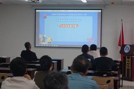在公开课授课过程中,全体教职工认真观看了礼堂、教学楼、宿舍等场所遭遇火灾,该如何逃生、固守待援、初起火灾如何扑救的疏散逃生演练视频,学习了灭火器、消火栓等消防设备的使用方法、步骤和电动车起火的危险性及安全注意事项,聆听了专家对火灾逃生热点问题进行的现场答疑。
