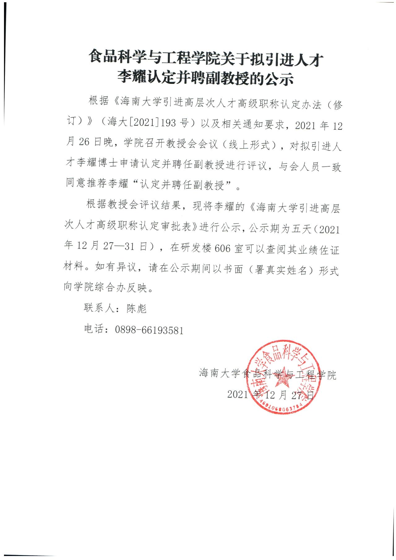 公司关于拟引进人才李耀认定并聘副教授公示