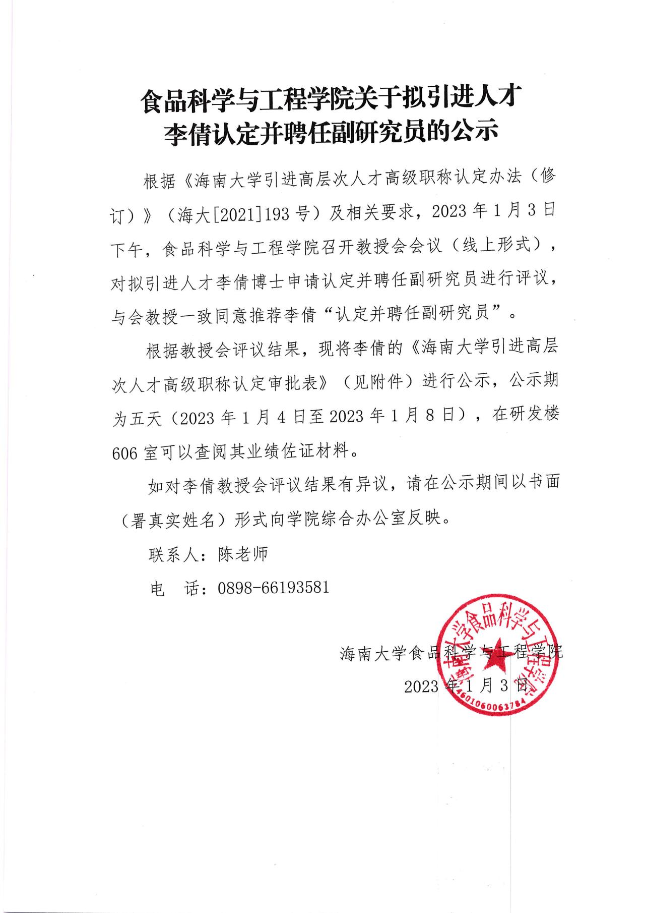 公司关于拟引进人才李倩认定并聘副研究员公示